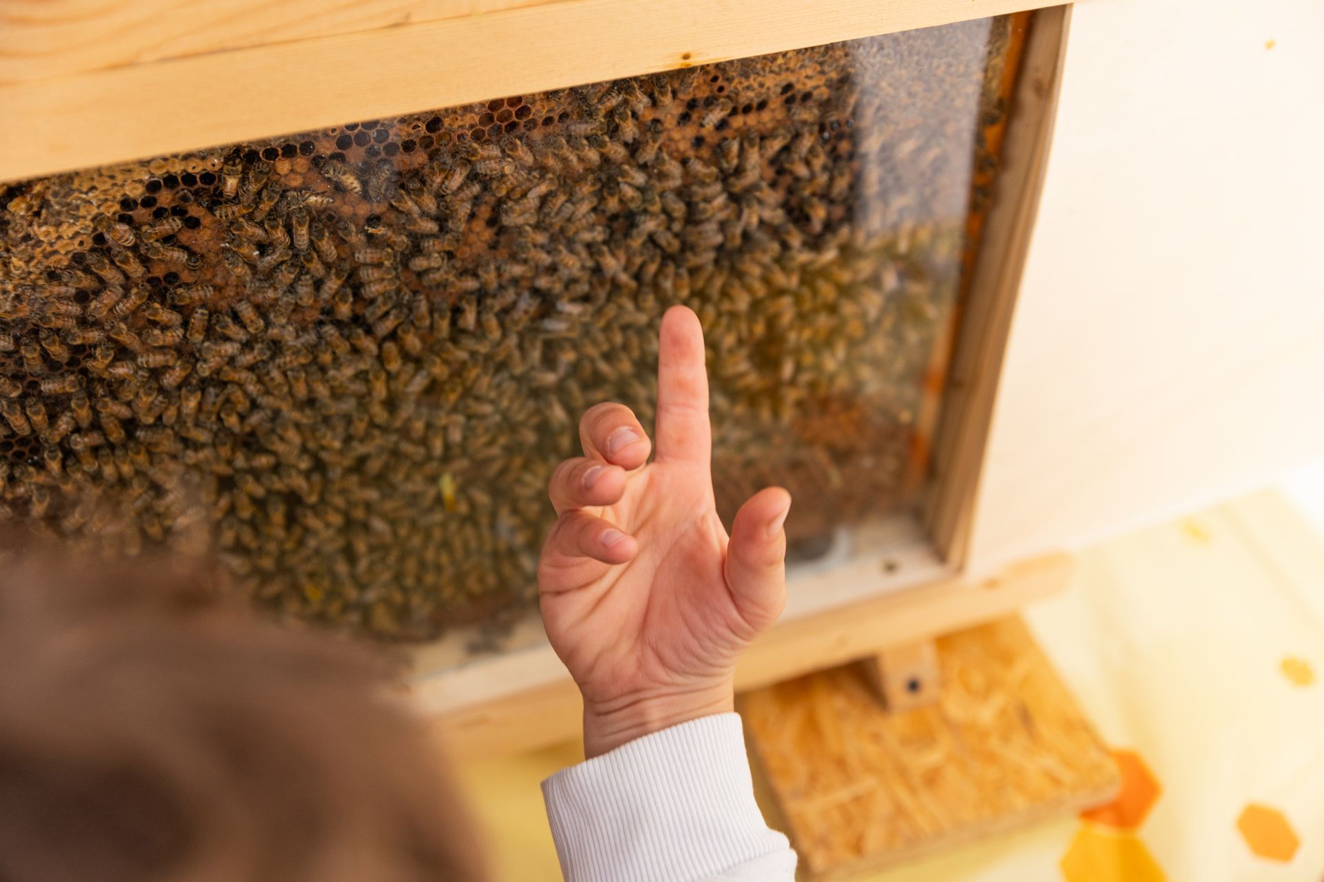 Ruche de démonstration vitrée habitée avec un cadre d’abeilles et la reine, sécurisée.
